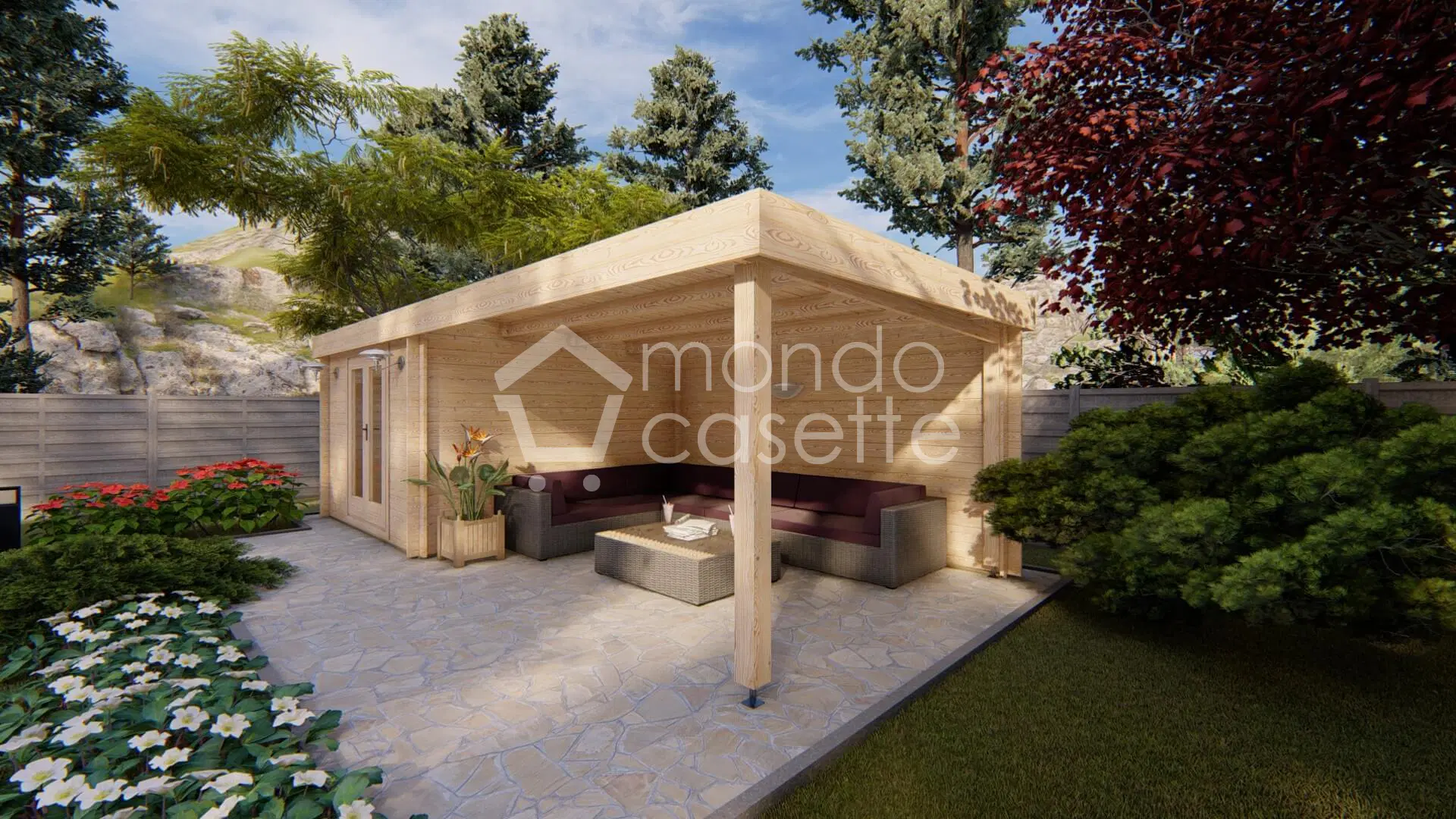 Con la casetta Yasmina in legno massello di abete nordico naturale potrete decorare il vostro spazio verde; è dotata di una superficie interna di 9 mq e di uno spazioso porticato.